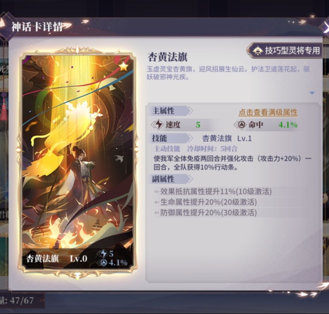 初期还是推荐豪气圣盾,后续肉度上来了可以换杏黄旗。