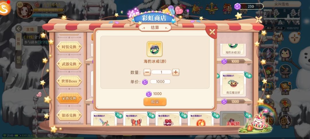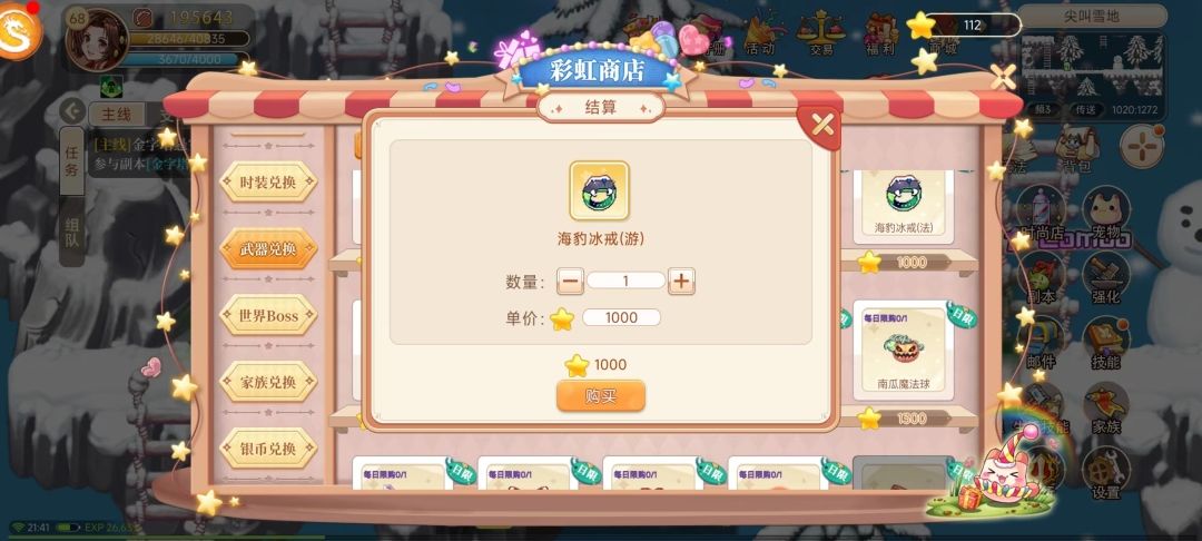 其次我们可以通过彩虹商店武器兑换来获取,需要玩家50级才可以开启海豹冰戒兑换,在武器兑换消耗星币来兑换戒指等,星币可通过分解装备、淘淘乐和每日历练藏宝图可以获得,这个方法就比刷怪快捷靠谱的多(小布曾经刷了一天就是刷不出戒指)。