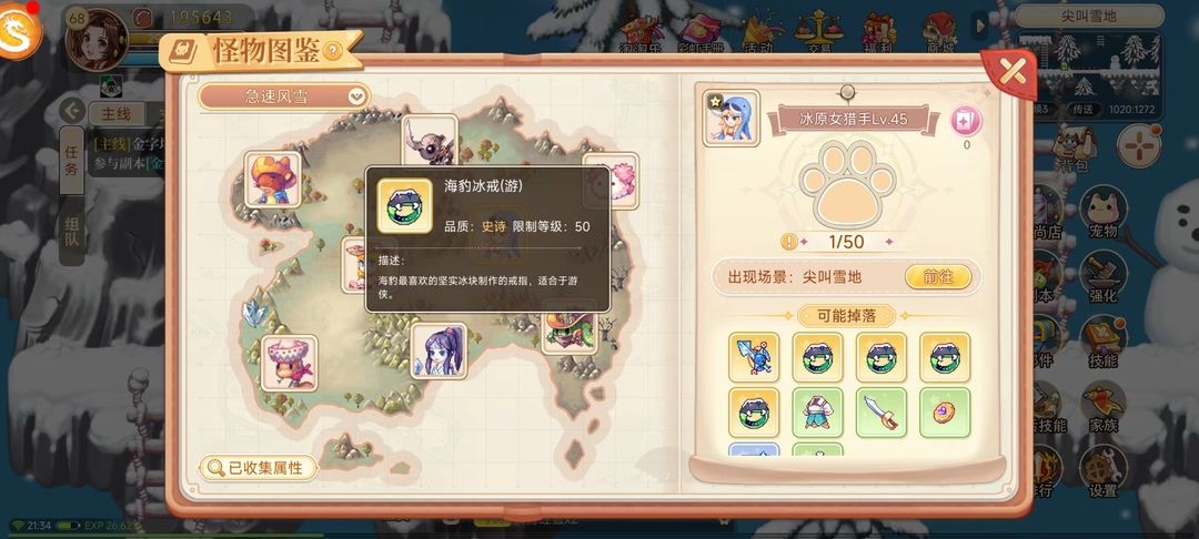 我们可以通过刷取冰原女猎手来获取海豹冰戒,冰原女猎手位于尖叫雪地,是雪地的BOSS怪物,平时出现在雪地中。消灭冰原女猎手就可以有机率获得稀有武器海豹冰剑和海豹冰戒,我们主要的话也是刷取戒指,但由于所有职业戒指刷怪点都在这里,所以我们尽量人少才去刷,爆率也不高。