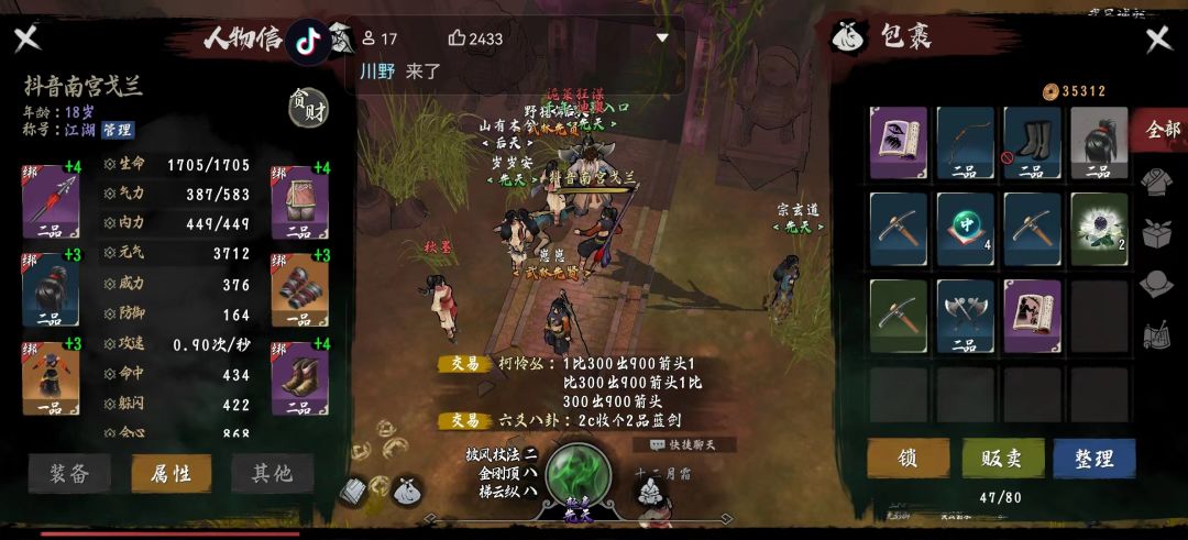 二品紫色武器,第二本外功,护体,身法。下册全部学满。手法差的玩家,也可以过。
