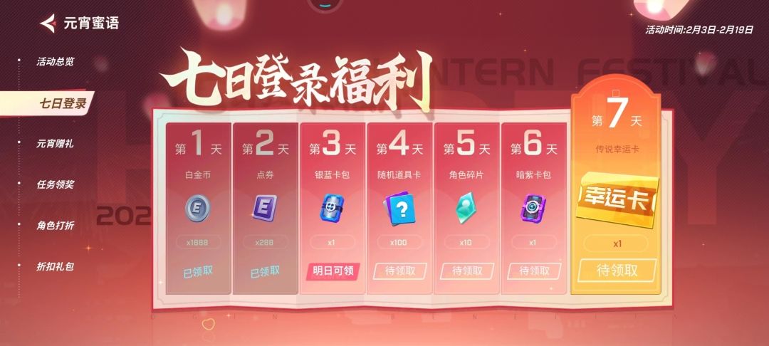 第一个活动就是七日登录活动,少年们只需要在2月3日到2月19日期间,登录就可以领取对应的奖励,白银币、点券、卡包······等多种福利好礼,丰富资源奖励等待少年们签到解锁哟~