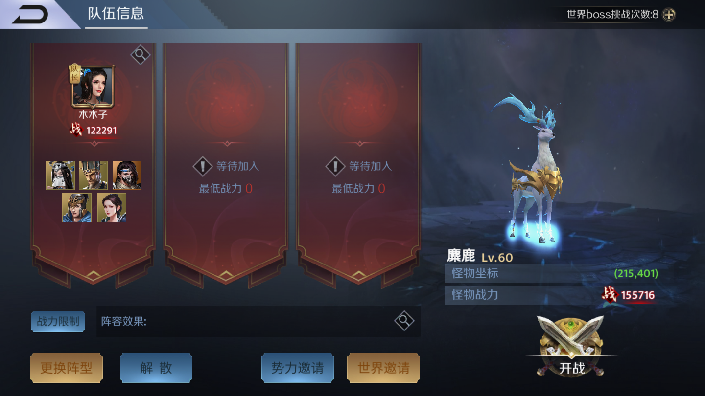 玩家可创建队伍,在势力邀请和世界邀请人一起攻打世界boss,当然,玩家实力够硬的话也可自己单打独斗去挑战实力强横的boss。