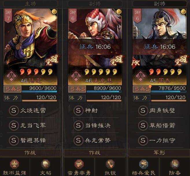 总结:从战报来说,总体的表现还是可以的,并且也具备多穿强度,尤其是陆逊可以稳定吃到暂避,基本上是不容易出现被爆头的问题,加上周泰的分担伤害,可以更好的保证太史慈打持续的输出!这队伍陆逊和太史慈基本上很难出现暴毙的情况,想要做到那样,就得率先秒了周泰,可有草船+一力拒守+惜兵爱民这样的回复,周泰也是非常耐抗的!其他的话,这个对也没太多的说法,没无当飞军可以带士别三日,没一力拒守换个合军聚众也是可以玩的,强度变化不会太大!