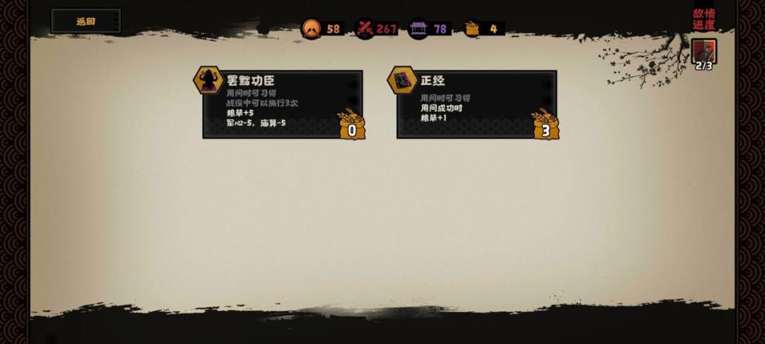 接下来说一下正经技能,看到这个技能,突然感觉官方这名字起的好没有水平啊。但是这个技能说好不好说坏不坏,请听我继续讲述。这个技能属于用间时触发消耗3粮草,用间成功时获得1粮草,但是获取这个技能需要用间,你无法确定需要耗费多少粮草才会解锁这个技能,比较而言你这是在用高额粮食影响战局,也就是在最后决战前无脑用间解锁,要是没有粮食你还要进行探索,感觉入不敷出。