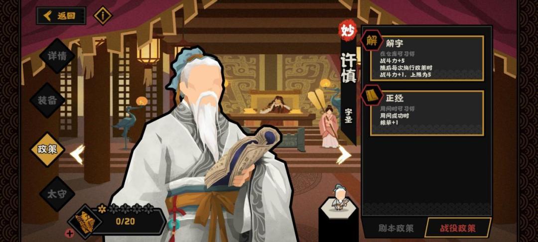 首先说一下许慎的战役技能,解字和正经技能。解字说白了只加10战力,正经是用间成功触发加1粮草。具体技能阐述请看下图。