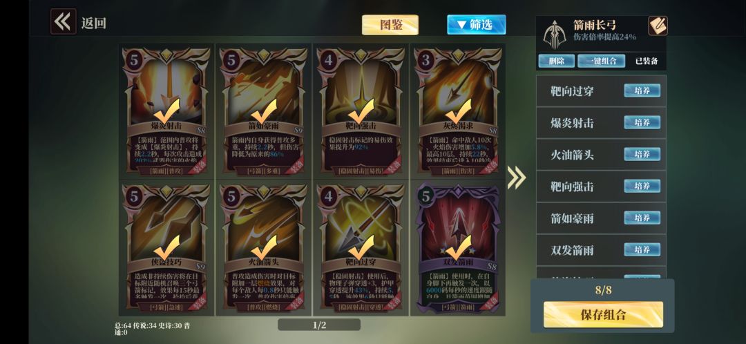 火弓卡组因为我是弓卡全有,全部卡都试过了那两张追击物理伤害的卡基本没用(为什么没用呢这里仔细说一下吧,第一张:使用技能后子弹2.2秒追击物理伤害的卡,因为火弓基本都堆火穿了,物理穿透几乎没有,不谈物理穿透不够会被格挡的情况,测试结果一次普攻追击1-2万左右的伤害,2.2秒你能普攻几下?第二张:就是那张s9赛季的新卡,普攻追击5次被稳固射击标记的目标,追击5次5万-10万的样子,可能会多点,但不影响这张卡没用,没有标记这张卡是不触发的,实战基本没用,特别是无尽深渊一堆怪能不能打到你标记目标都难说。说白了不如箭雨点燃目标的紫卡,每秒还能跳1万多伤害呢)