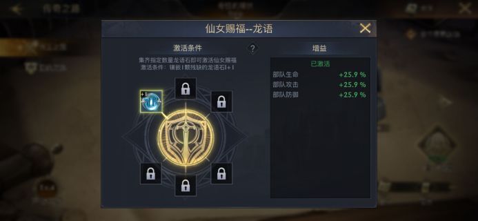传奇之路想要通关更远,每关的卡牌增益和仙女赐福BUFF必不可少,而这里就和大家的实力相关了。寻王之旅中,每一章会有一种仙女赐福,能够大幅增加各位领主的战斗属性,装备、神器、宝石、印记、龙语、特定英雄、英雄职位都有可能影响到仙女赐福的激活条件,若自身装备、神器、宝石、印记、龙语、或特定英雄高于当前激活要求,则立刻激活;若等于当前要求,则需要满足所有激活条件,所以大家要去提升对应的模块,才能在传奇之路中走的更远。
