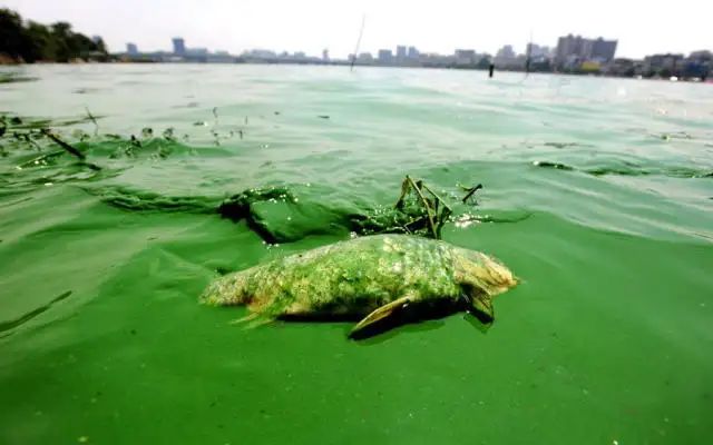 若水体富营养化严重(指在人类活动的影响下,水质恶化,鱼类及其他生物大量死亡的现象);含碱性较高且水温长时间高于20℃的情况下,蓝藻则容易大量繁殖,导致水面漂浮一层具有恶臭味的绿色浮沫,这一现象被称为“水华”或“绿潮”。水华的发生会导致水质恶化、无光照、水中氧气断绝,从而造成水生物的死亡。