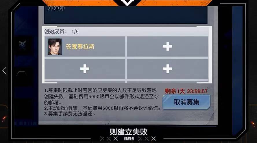 我们需要在规定的时间内召集六个创始成员,不同的募集时间对应了不同数目的银钱,如果超过时间还没有召集到人,系统就会判定我们创建失败。