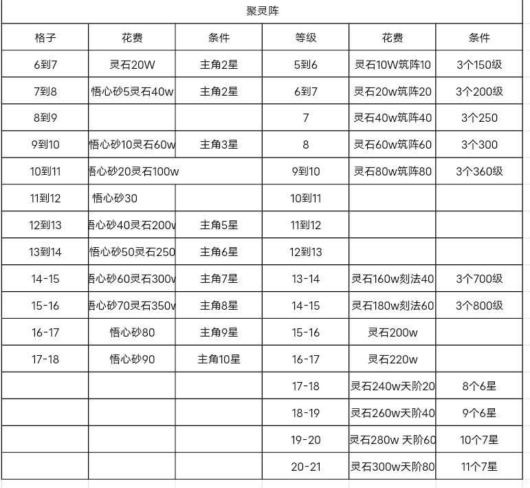更新了聚灵阵升级花费和限制条件