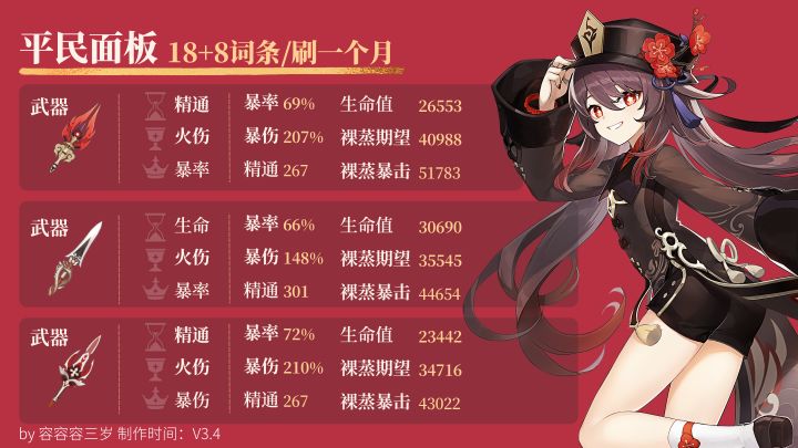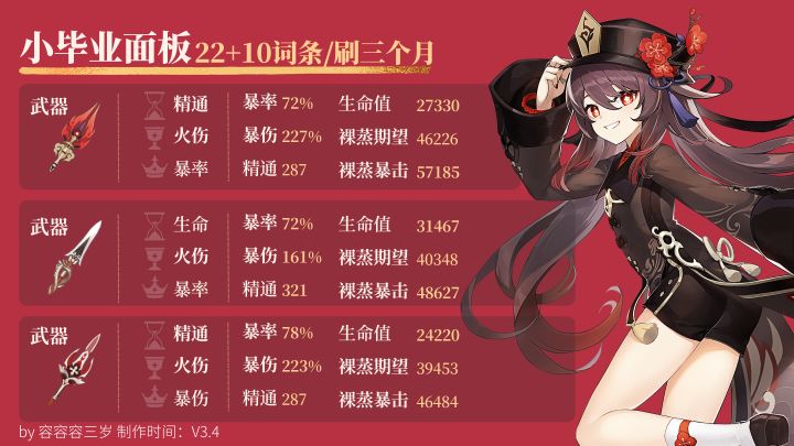 胡桃马上就要复刻了,因为胡桃算是老角色了,为了兼顾萌新和老玩家,我们提供了多套毕业面板供大家参考练度!