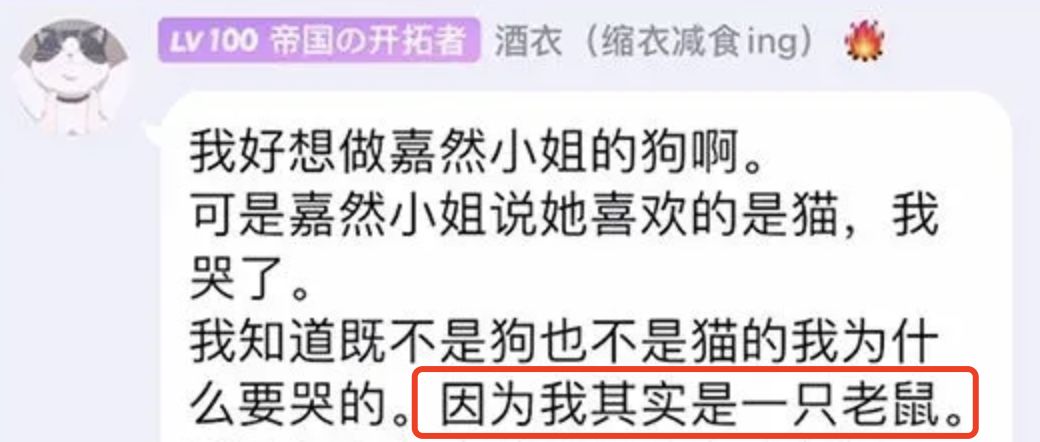 有关鼠鼠文学的出现众说纷纭:有人说这发源于百度孙吧网友们的自嘲;有人说是由B站“叔叔我啊”的梗衍变而来;也有人认为,这起源自于2年前,网友@新户眠子写给虚拟主播的发癫小作文《我好想做嘉然小姐的狗》。