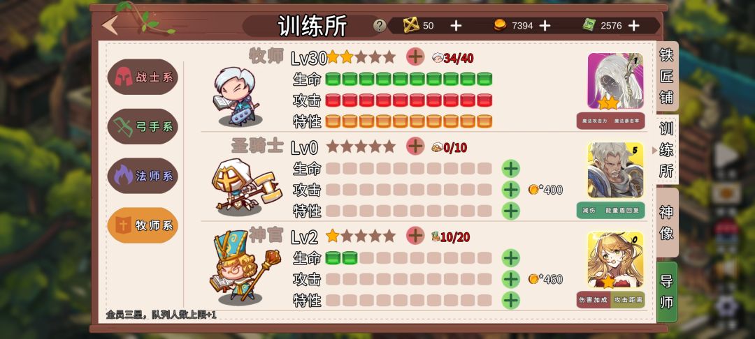 黑暗术士禁忌低语是核心输出,要导师sr 3级才能出这个卡片,有的导师需要sr四级,神官魂归是二级牌神技,我是ssr导师2级,sr2级好像也可以,可以自己试试,这个技能无限复活自己,盾卫是提高生存,配置如下配置