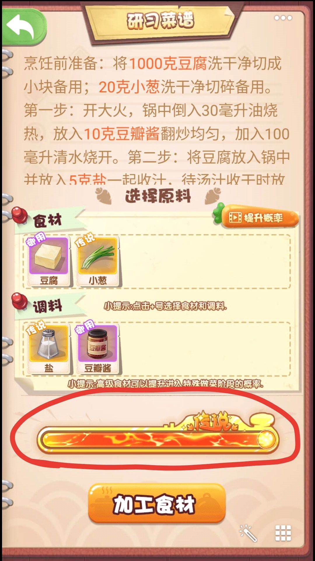 2.如想更好的做出五星菜或者招牌菜,尽量使下方的进度条为传说。这样进入做菜进程后调料框为最佳最粗状态,每次极品连击都会使下一步的极品区域最大。当然欧皇们也可以靠脸吃饭。不用每次都把进度条拉满。在同样满传说进度条的情况下,尽量使用传说食材(也就是第一行)次之用传说调料,因为在同样都获取途径下,调料需求大于食材需求