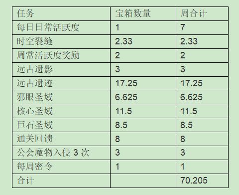 周常任务中的时空裂缝,周常活跃度,远古遗影活动可以获得宝具宝箱。数量如下: