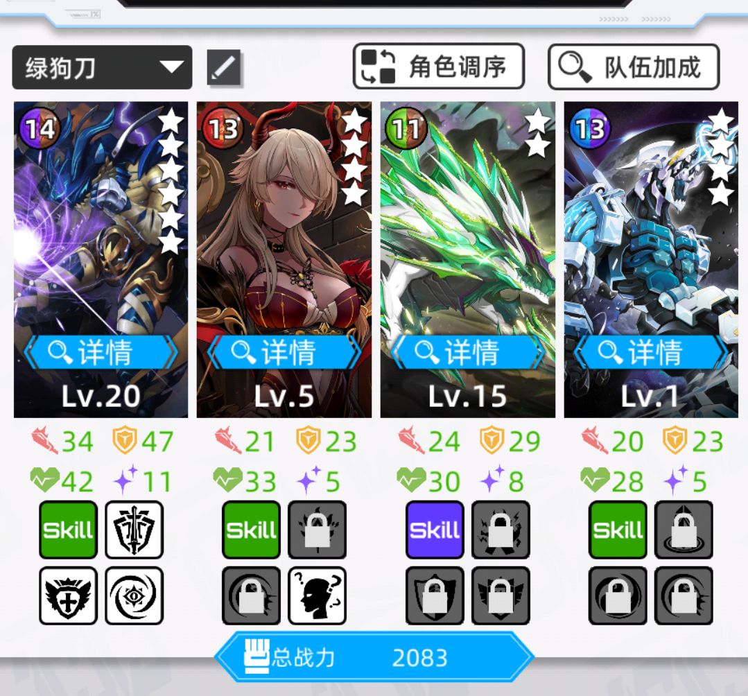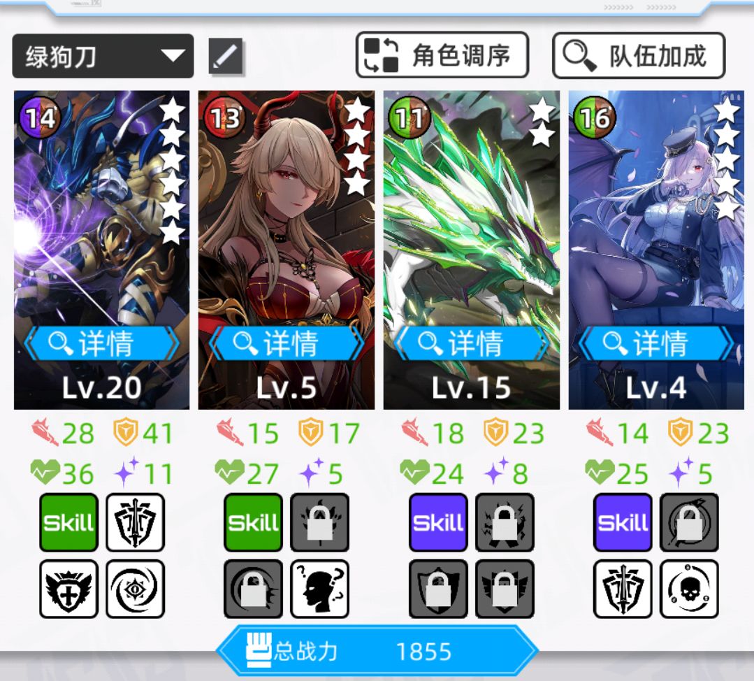 懒得手操时间足,或者自动选关的话,四号位放拉菲之类四消或充电宝的即可。