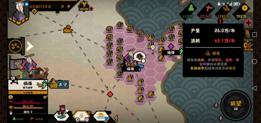 2.王翦出任太守(我的王翦是六级装备),粮食消耗变为69w