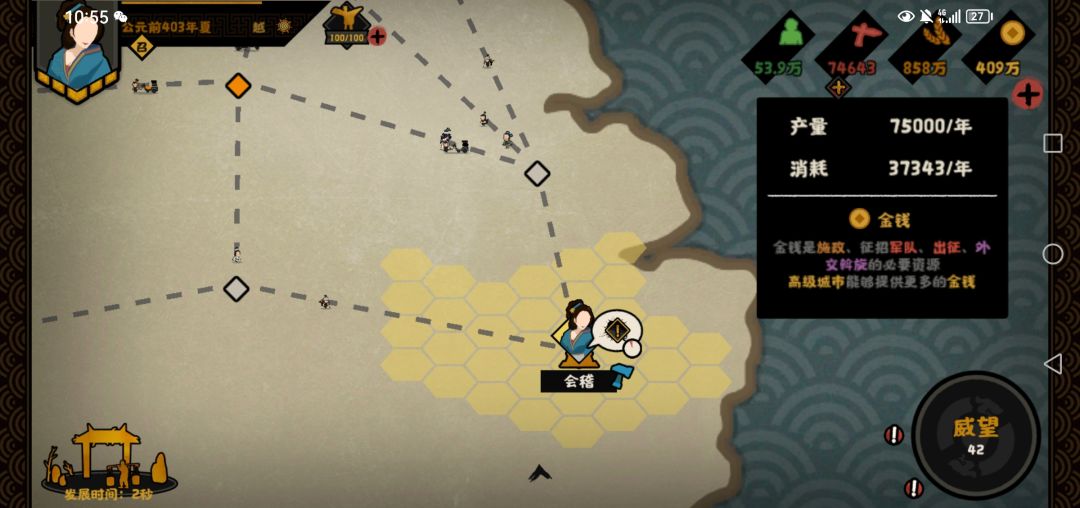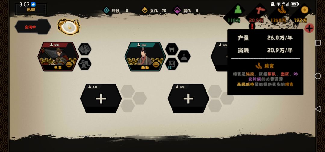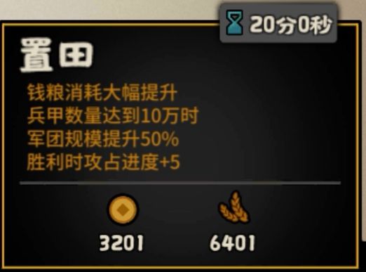 2.点出王翦的置田,钱粮达到感叹号。简单计算得出:1兵=3.6粮+1.8钱。