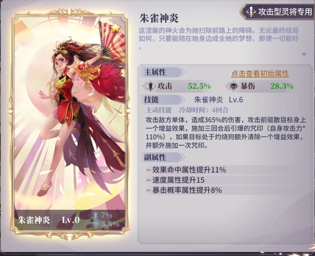 唯一选择:朱雀神炎。你会发现有朱雀神炎的朱雀和没有朱雀神炎的朱雀伤害差别真的很大。