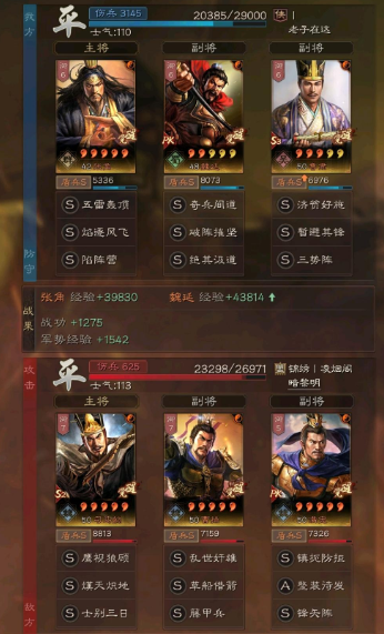 总结:这个队伍里张角虽然有着三势阵的加成,可少了太平道法的奇谋,总体伤害还是差了一大截,很多时候还是靠魏延的发挥!实战下来,和满红主流队伍打也有着一战之力,打杂毛队伍大概率能多穿,总体的表现却不会特别的出色,想打出上万战功还是得吃些白嫖队伍才行,打主流队伍估计也就六七千战功的水平,适合娱乐玩玩,不建议强行把张角魏延和鲁肃三位各大阵营的猛将拿出来组个比较一般的队伍,无论是张角天公盾还是关关魏或者鲁肃的其他队伍,组起来的强度都不会太低,完全有实力用来当主队!