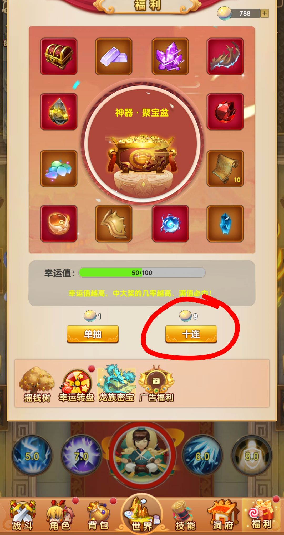 龙珠可以先抽奖,出橙色心法书(心法是前期提升战力最快的方式,10次10连必出4本)和聚宝盆。