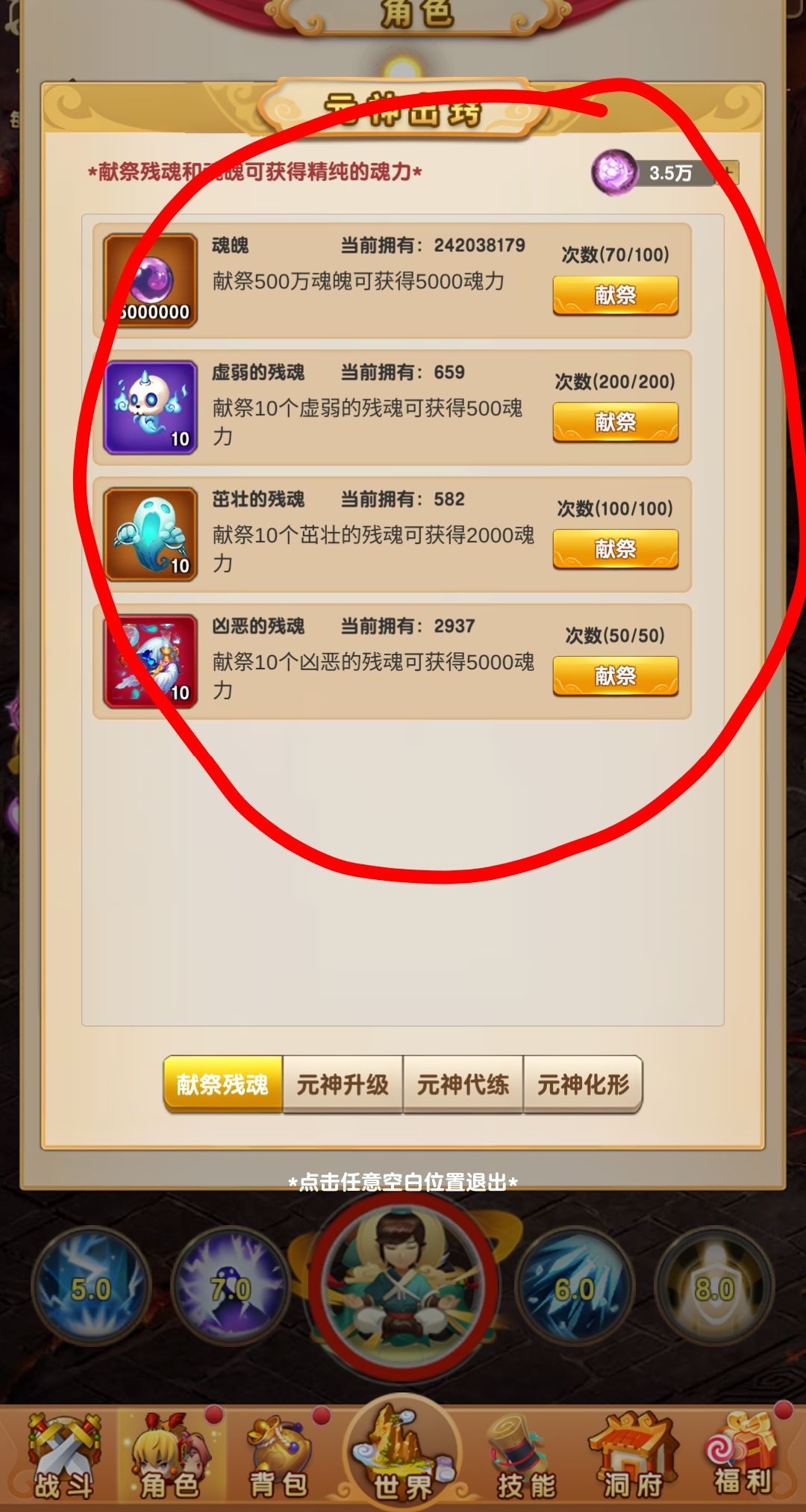 优先攻击药水,然后是防和血,新人好像是最多2000个,每提升一次大境界多500个,每转生一次也多500个(转生材料彼岸花来源地狱,地狱先做钟馗声望任务,可以增加到100层,前50层每十层一朵花,后50层每5层一朵花,一轮15朵🌸,建议能转生就转生这个只多战力,先转后转都一样)。