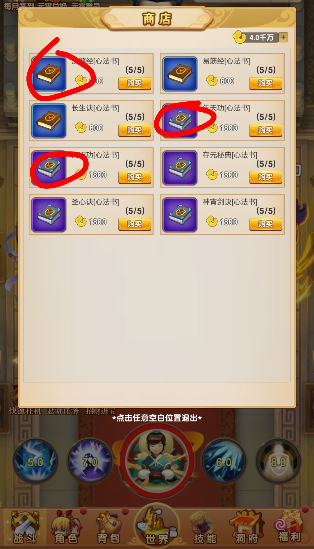 然后是算卦的和五庄观,提示五庄观弄出人参果获取后,最好穿一套寻龙去,因为新人一定会刷一次人参果树,可能双爆人参果。期间去长安六扇门买心法,第一天扫货(蓝色可以买完,紫色的先天,存元买完,其他的先买一两本吧,第二天买完,蓝色的应该够满级了,紫色的得第三,四天才能满)橙色的心法就是前面抽龙珠,后期打龙王和厉鬼,如果有可能优先天衍神策和无为。