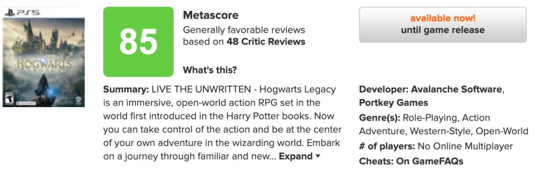 《霍格沃茨之遗》的媒体评分已经于昨天晚上公开,MC均分85分,收录42家媒体,IGN给出90分。