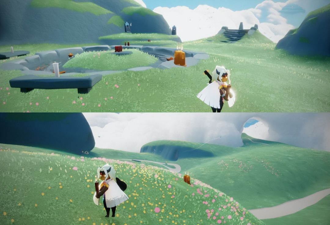 第二个季节蜡烛:拿完第一个之后我们继续往前走,来到蝴蝶平原地图,我们穿过云层之后直接往左边飞,在前面凸起的小坡就能看到第二个季节蜡烛。