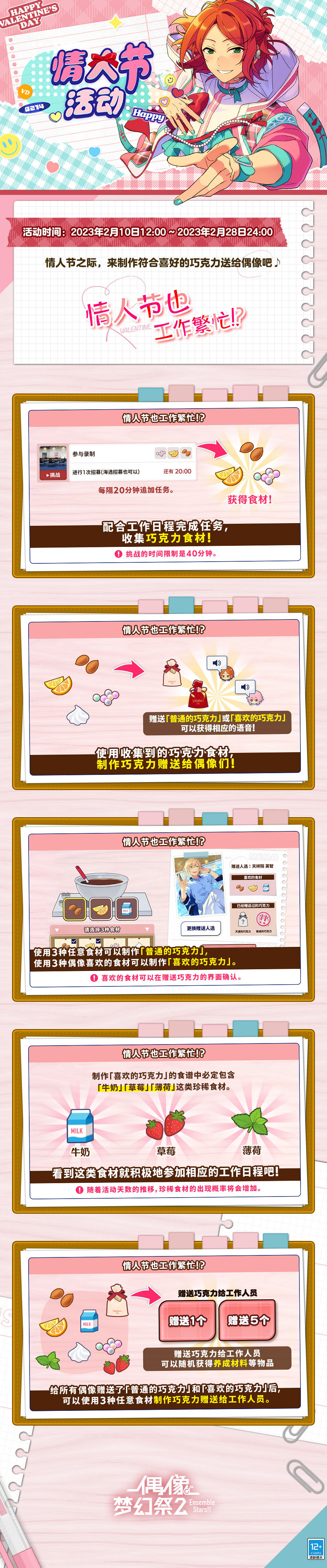 ▶获得全部活动限定偶像语音后,制作人可以制作巧克力并将巧克力送给工作人员获得宝石和经验券养成道具。