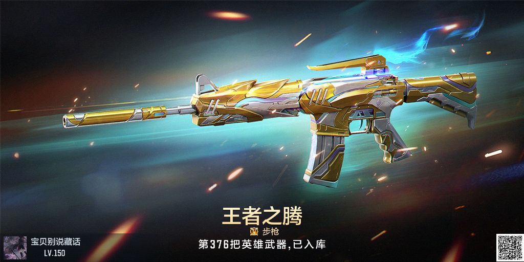 武器外观沿用王者的油炸效果,全身以稀有金属为主体,王者之腾作为M4A1-Rush-夜袭的升级版,不仅保留了原版夜袭细长而匀称的枪身,同时加上了顶级王者武器专有的金银配色,更是显得无比尊贵,作为首把手游原创的王者级武器,该颜值也完全不亚于以往推出的经典王者武器,以下即为其在仓库内的3P视角效果。