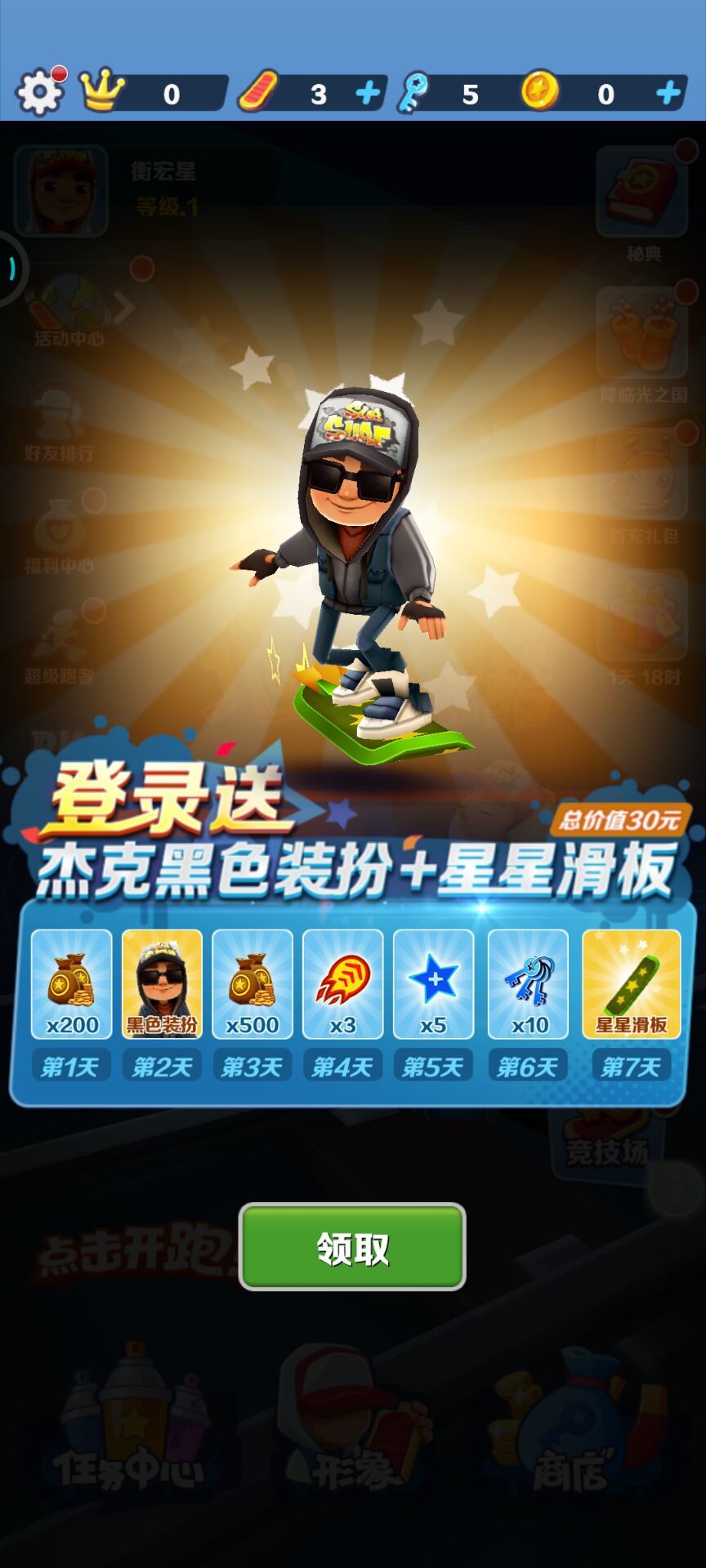 在进入游戏后会跳出一个新手7日签到,签到可以获得星星滑板和杰克的黑杰克装扮。新手过完7日签到后才可以正常进去版本签到,这里很多小伙伴问这个版本的巴尔坦杰克怎么获得不了原因就在这里。