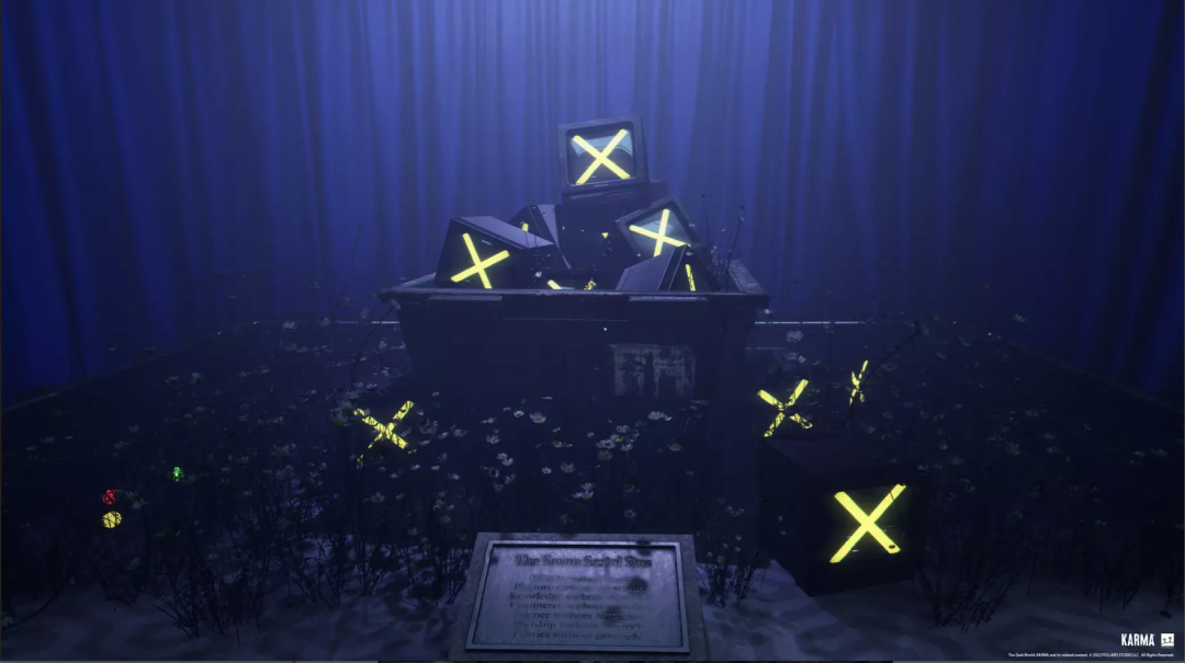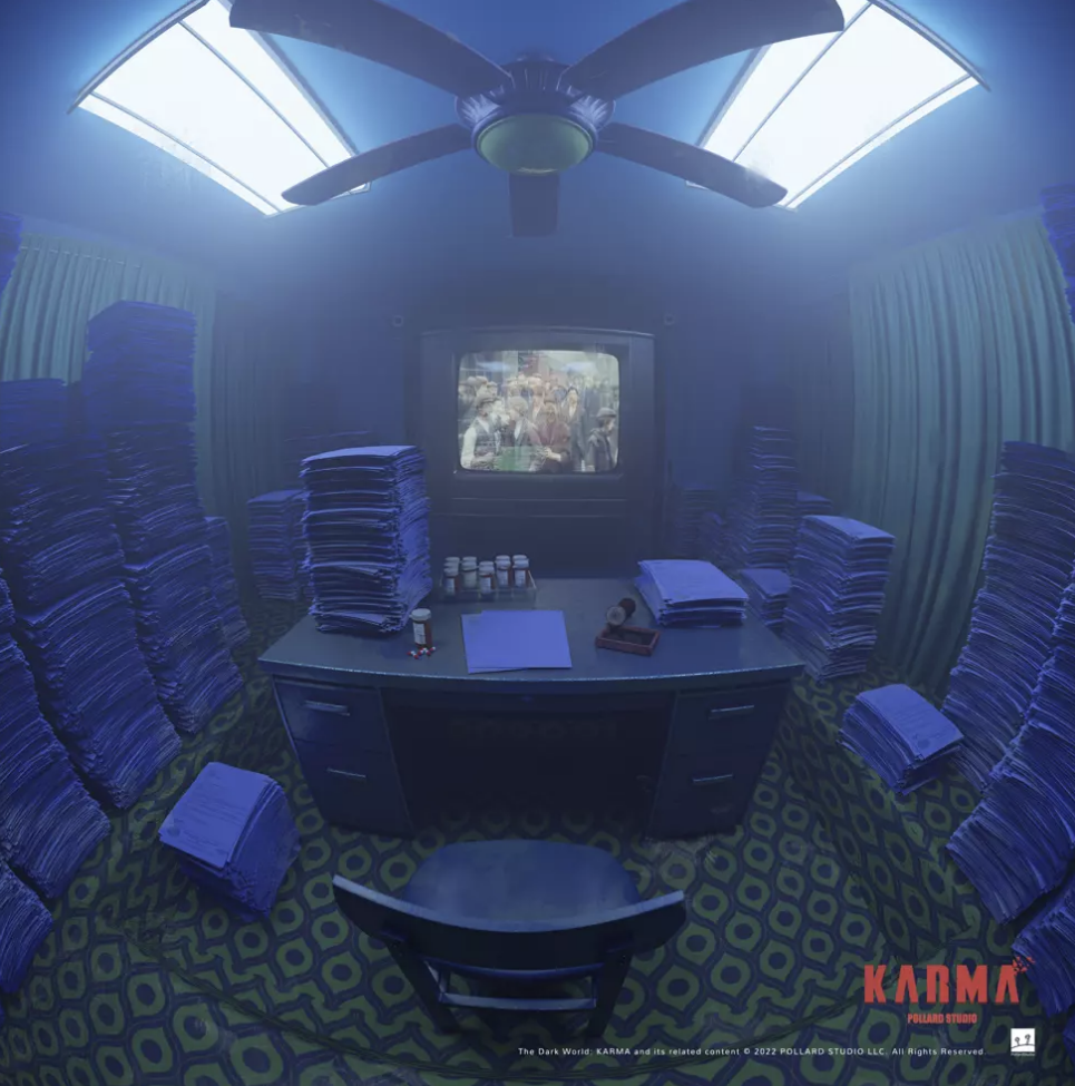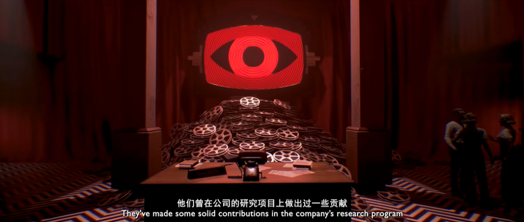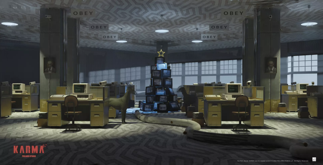 他们从《生化奇兵》《半条命》等游戏入手,借鉴了里面的细节设计思路,比如房间内的大型海报、涂鸦以及吃剩的罐头等等。 各类细节不仅可以潜移默化地描绘作品世界观,利用视觉代替文字,交代更多的东西,还能有效强化玩家游玩时的沉浸感。“可能你走在路上,抬头看到空中有个巨大的空艇,上面的电视在不断提醒着人们几点钟了,该回去休息了。” 在此基础上,《黑暗世界:因与果》将细节概念设计得更加惊悚、怪异。它的背景设立在一座被资本控制的城市中,各类阶级差异明显,名为“利维坦”的公司不断压榨着底层人民。 试玩demo里,玩家能够看到许多电视相关的概念设计。多个场景都以电视为主体展开设计,比如电视插到人的脖子上变成脑袋、电视堆放在一块变成“坟墓”等等。游戏还设计了一个办公室场景,每一张办公桌上都没人,玩家启动某个机关后,键盘会开始自动敲击输入,荧幕上则闪烁着员工的大头贴,以及一两句自述——“在这里工作,我很满足快乐”。