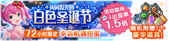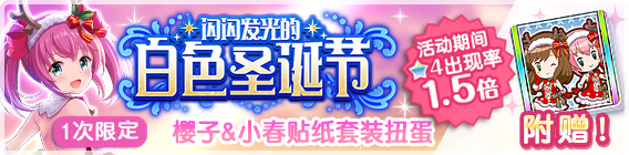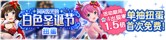 7月30日(周四)维护后,将开启「闪闪发光的白色圣诞节扭蛋」,与「闪闪发光的白色圣诞节扭蛋」出现成员相同的必得扭蛋也将同时登场,活动期间☆4出现概率提升至1.5倍,第一次「1次扭蛋」可免费进行抽取。