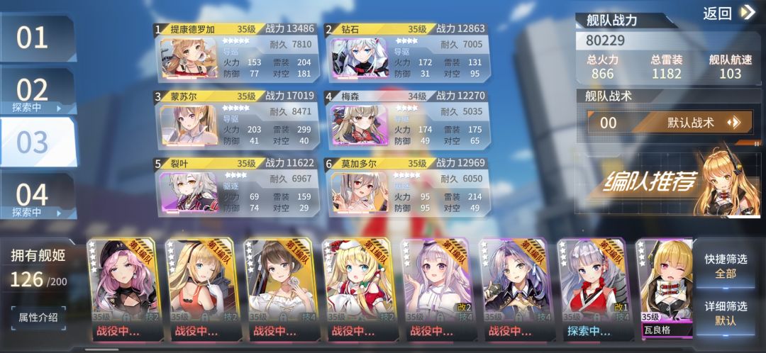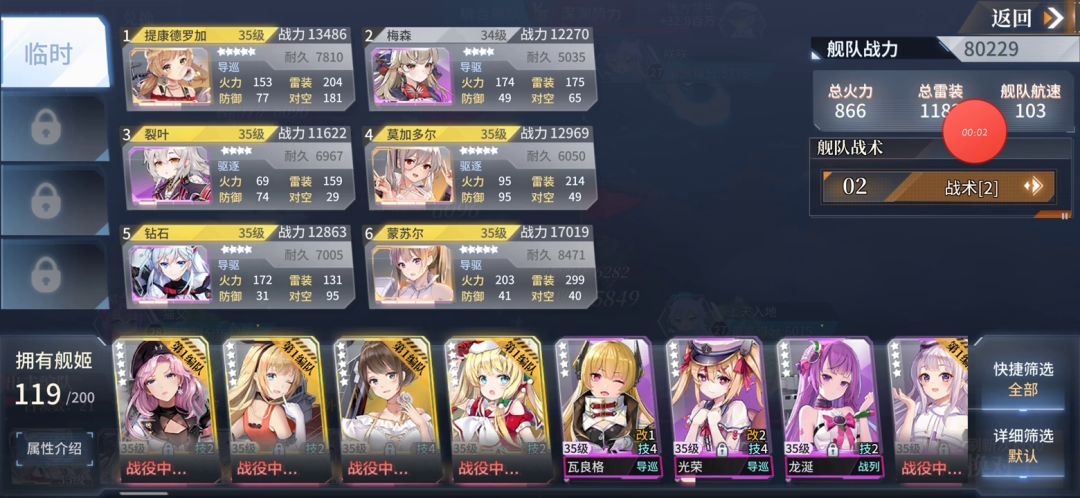 其余人装备副属性尽量选择耐久,毕竟只有活得过提康德罗加才有被奶的资格。附属装备选择航速,只有速度够快,才能快速冲到中距离抢占先手。提一下可以给蒙苏尔带炮弹,她天生高幸运,暴击几率不低。当然也可以带雷达堆增效和幸运提高技能触发概率,这个仁者见仁。