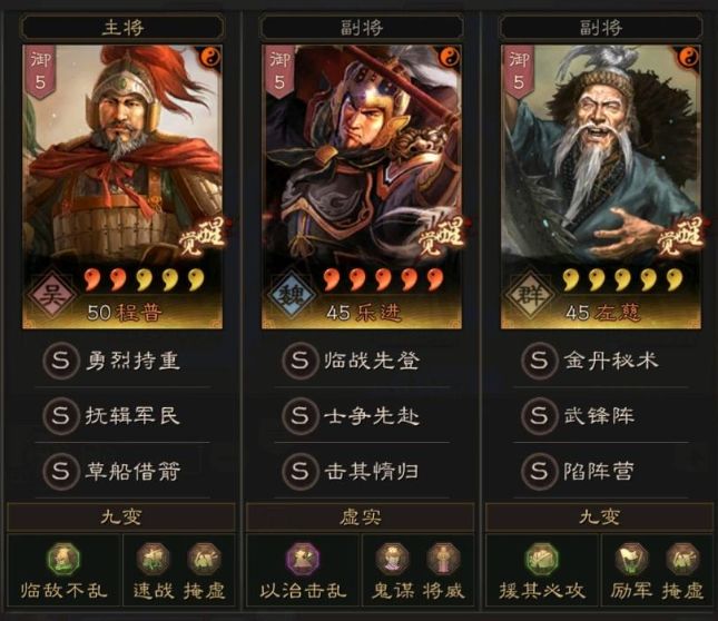 总结:玩这套阵容的话,主要还是给一些凑不齐主流强势阵容的兄弟们,因为很多玩家即便到了PK赛季,也可能出现厉害的国家队缺将,导致组不起来的问题,甚至真正红的就甘太程这个队伍,可打架强度也不够给力,其他武将也以白板居多!如果是肝帝玩家或者时间较多的玩家,那么陷阵营换藤甲兵拿来吃菜刀也是没问题的,即便是脸黑真的碰到了点火队伍,有草船借箭+临敌不乱+程普自带的概率控制,也不是完全没有赢的可能!这个队伍的优势之一在于前期就可以做到15御出门开荒,然后不用考虑转型问题,既能打地也能打架,快速发育成型,然后出第二队!