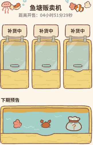 贩卖机玩法:鱼塘贩卖机会在3个时间点开放,分别是上午8点到10点、中午12点到下午2点、下午7点到夜晚9点,贩卖机中一共有3个柜子,到时间就会有3种鱼进行售卖,这时候就要用鱼饵购买,购买的鱼种类不同所需的鱼饵数量不同,例如:螃蟹—6鱼饵、鲨鱼—12鱼饵、小丑鱼—5鱼饵,而非规定交易时间点开贩卖烂会显示补货中,补货栏会显示即将上架的鱼。