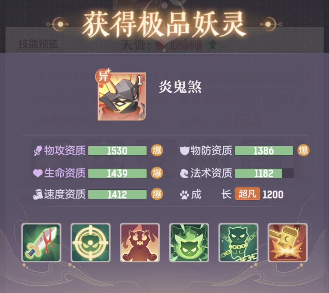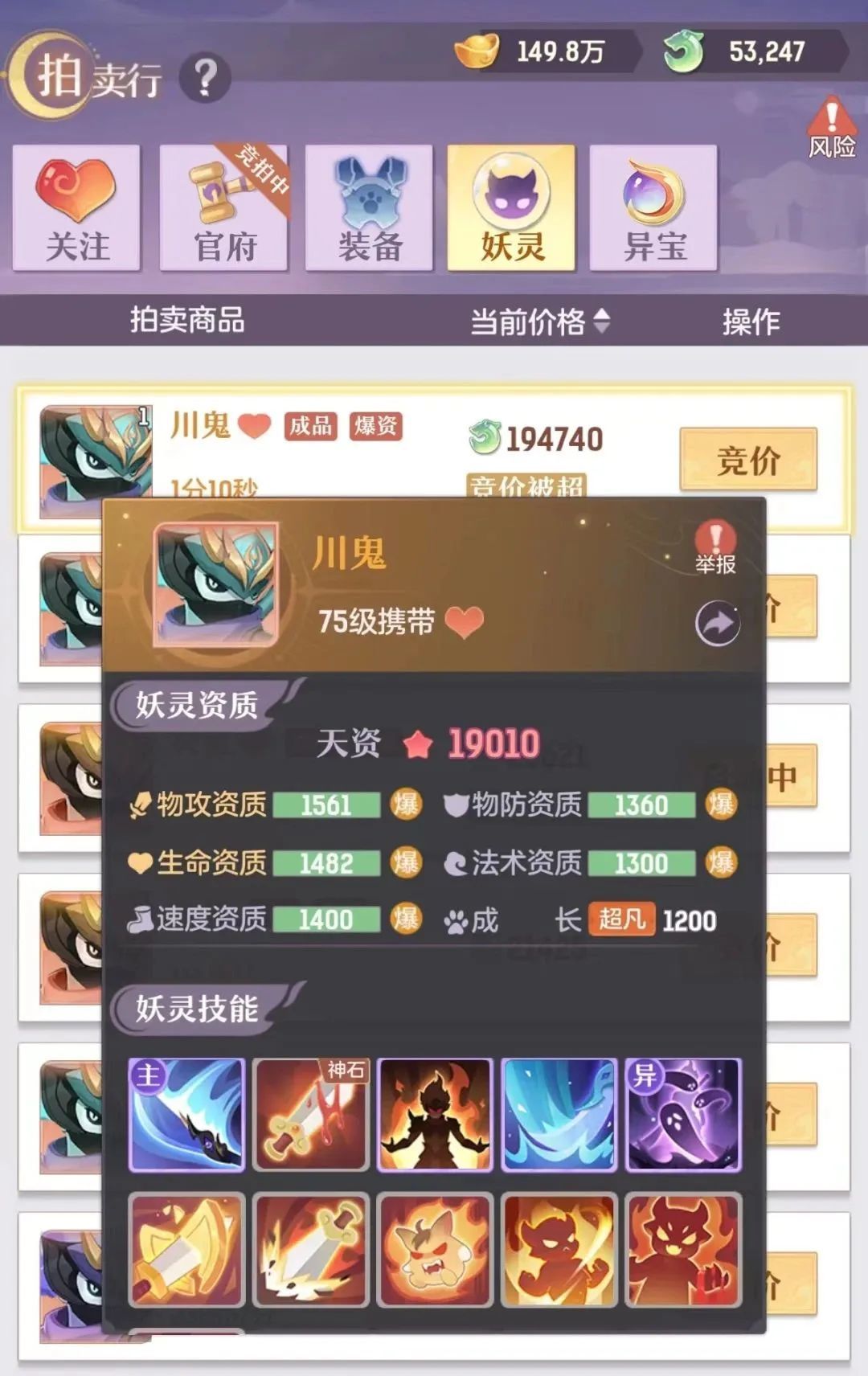 拍卖行成交价21万的鬼将充分诠释了“极品妖灵”这个词!作为一只资质极佳的水鬼,其打书养成选择有很多,耐攻、暴力输出、隐身克制、闪现克制等路线,百搭好用,你值得拥有。