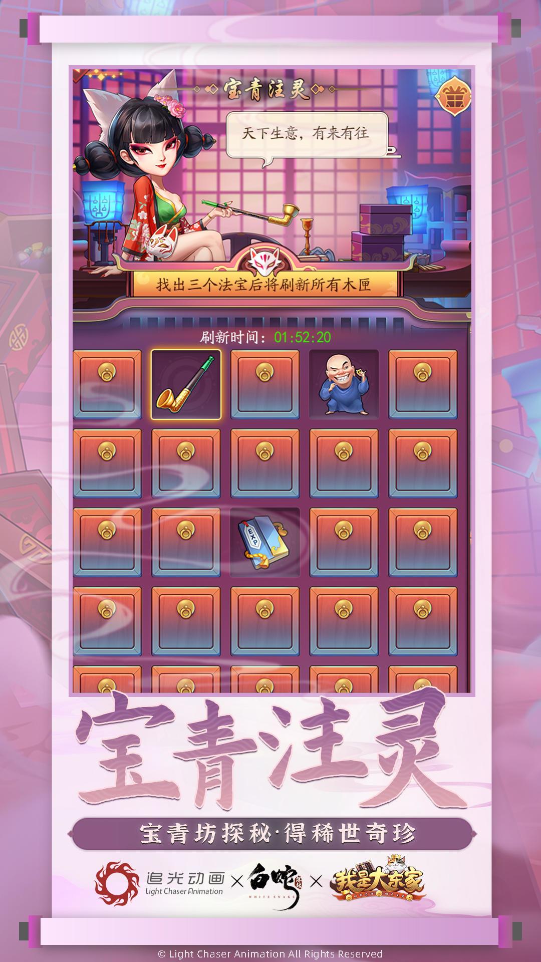 听说宝青坊内有一神秘区域,非坊主邀请不能进。而这次各位大东家将有机会一探宝青坊内部,千百木匣等待开启,只是开启机会有限,各位又能不能在规定时间内完成任务呢?