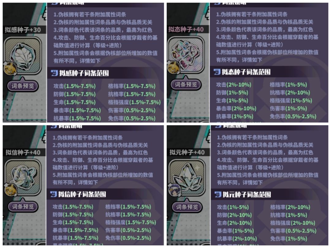 I、伪核词条最高红色,优选攻击,暴击,暴击强度词条,其次部分角色需要生命或者免伤。建议前期保留带1极,2极,1红等词条伪核。