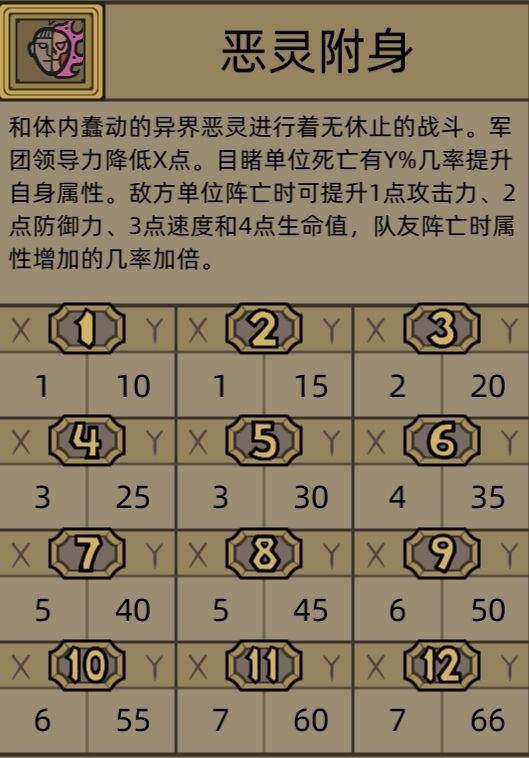 1.1接上条,进入第1关后,优先找“落单的中立3星单位”单挑,获取大量经验值并主升“恶灵缠身”技能,第一次升级后可将该技能升到3级,然后招募一批“1星、2星低价单位”送掉。之后再击杀若干单位升级,把“恶灵缠身”技能升到4级(杀敌25%几率提升属性,友方死亡时50%几率属性提升),再招募一批“1星、2星低价单位”送掉后迎击魔王;
