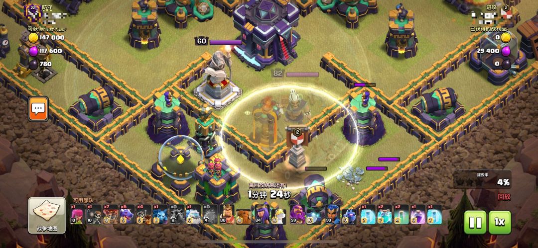 例如这次进攻(图234),飞艇模型已经进墙内了,他就把飞艇摁爆了,但实际上飞艇的影子还在城墙外,所以援军的落点也落在了城墙外,最终进攻就失败了。