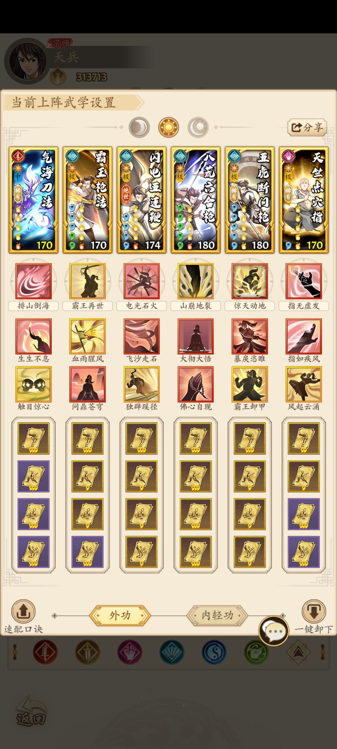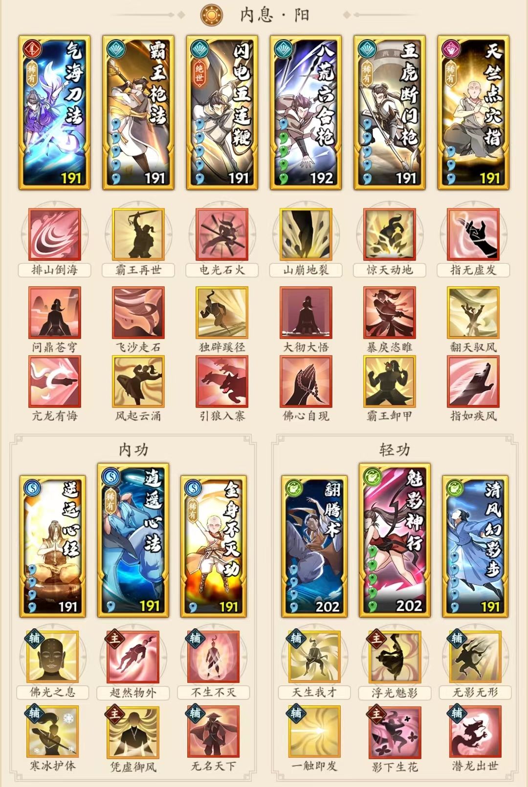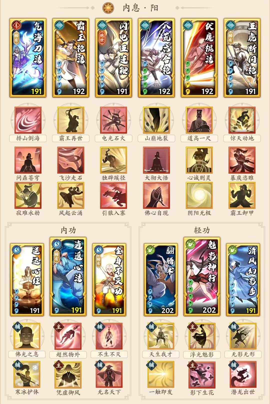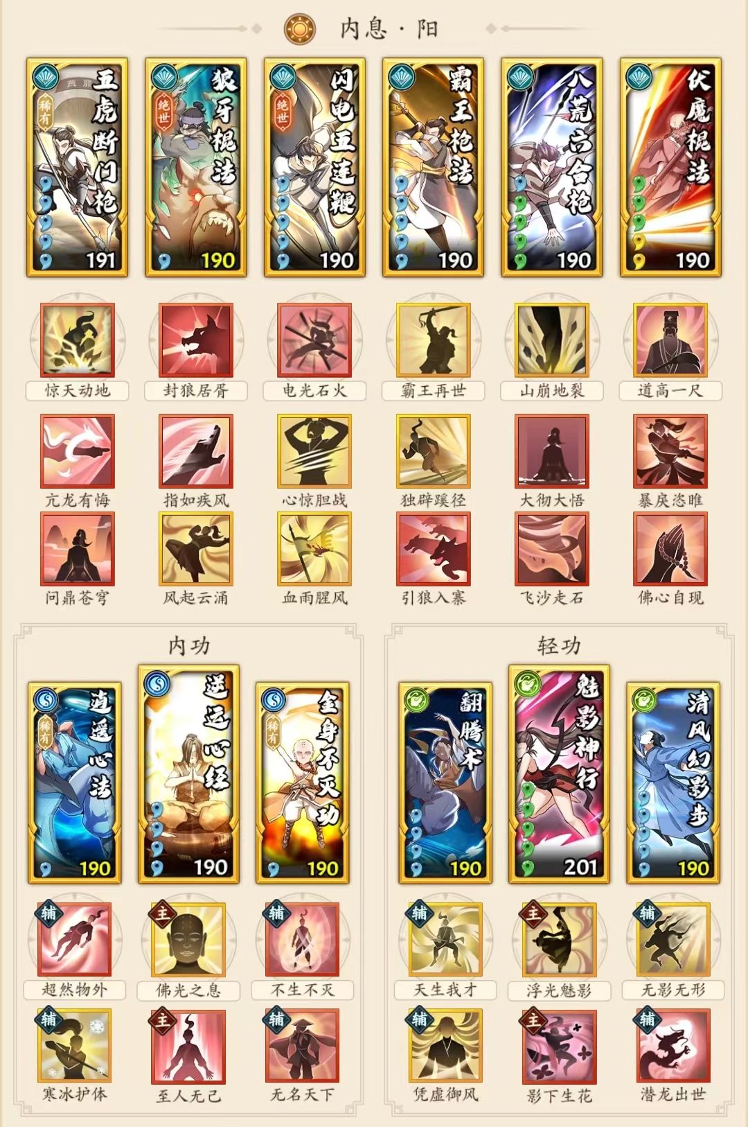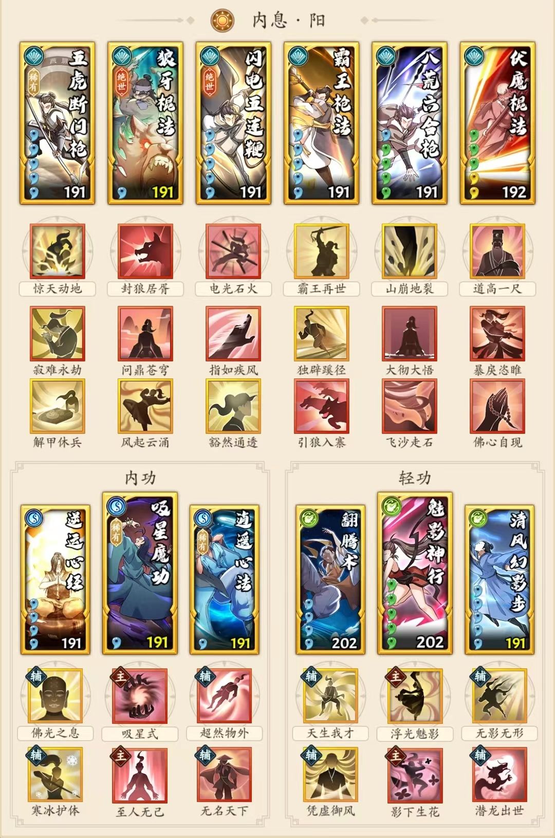 搭配思路:强调聚气+增伤,阳枪五件套前置,再加一个自选(点穴、飞龙神掌、狼牙棍法、气海刀法等等),笔者贴一张阳枪+点穴的配置供参考。