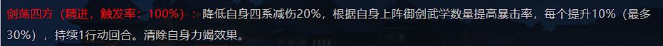 个人评价:此阵容大部分是精进招式,故“影下生花”极为重要。相比于上面的阵容,这套的伤害上限会更高,由于放弃了带吸血的“血雨腥风”,追求的就是一轮结束战斗。而且在打传统吸内拳时,胜率还挺高,主要原因是气海的“心惊+散功”作用明显,加上后手的“寂难永劫”,能减少吸星的触发。