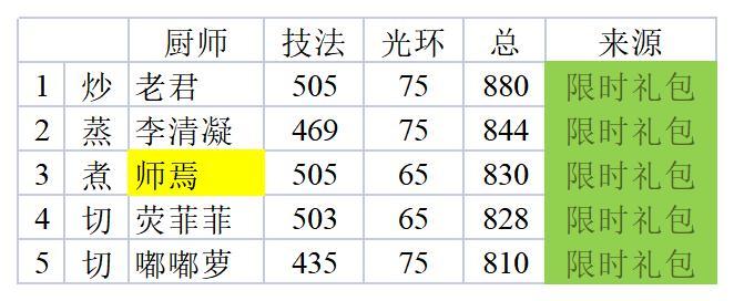 3.师焉,最强煮环!秋香光环值高,但是本身技法略低,屈居第二!屿人,最强白板!灵兮,前面居然一众白板厨,丢人!