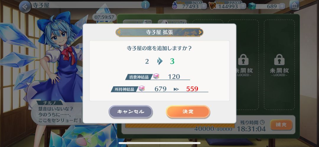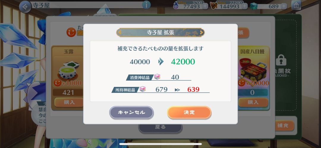 寺子屋的容量:首先要说明的是10000份的零食可以供一个人使用13个小时,也就是说:不开5号位是完全没必要扩容的,一天上线补充两次即可(而且和道场的12小时时间对的上),开5号位的话可以选择性的直接扩1w,如果勤上线的话不扩也没什么问题(最后面两个零食不要买);