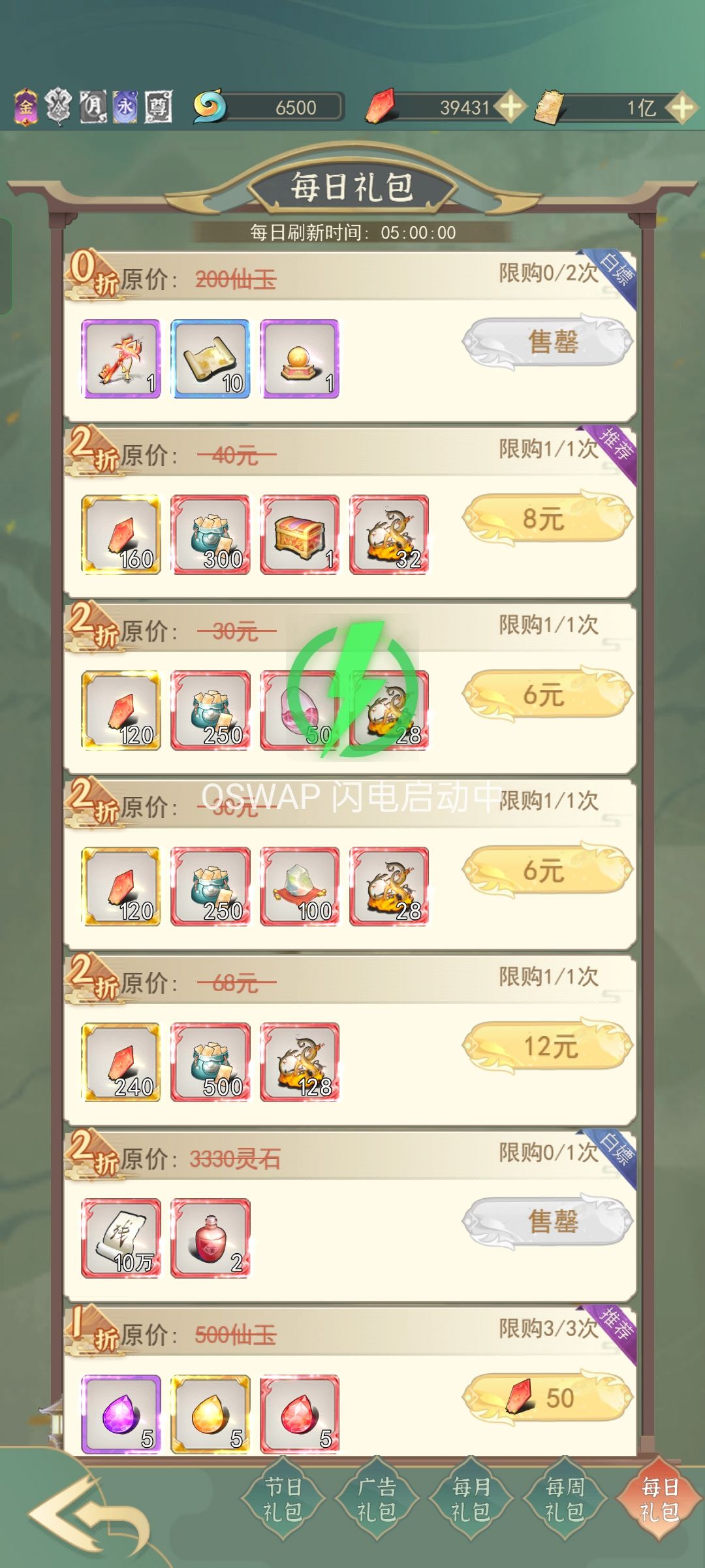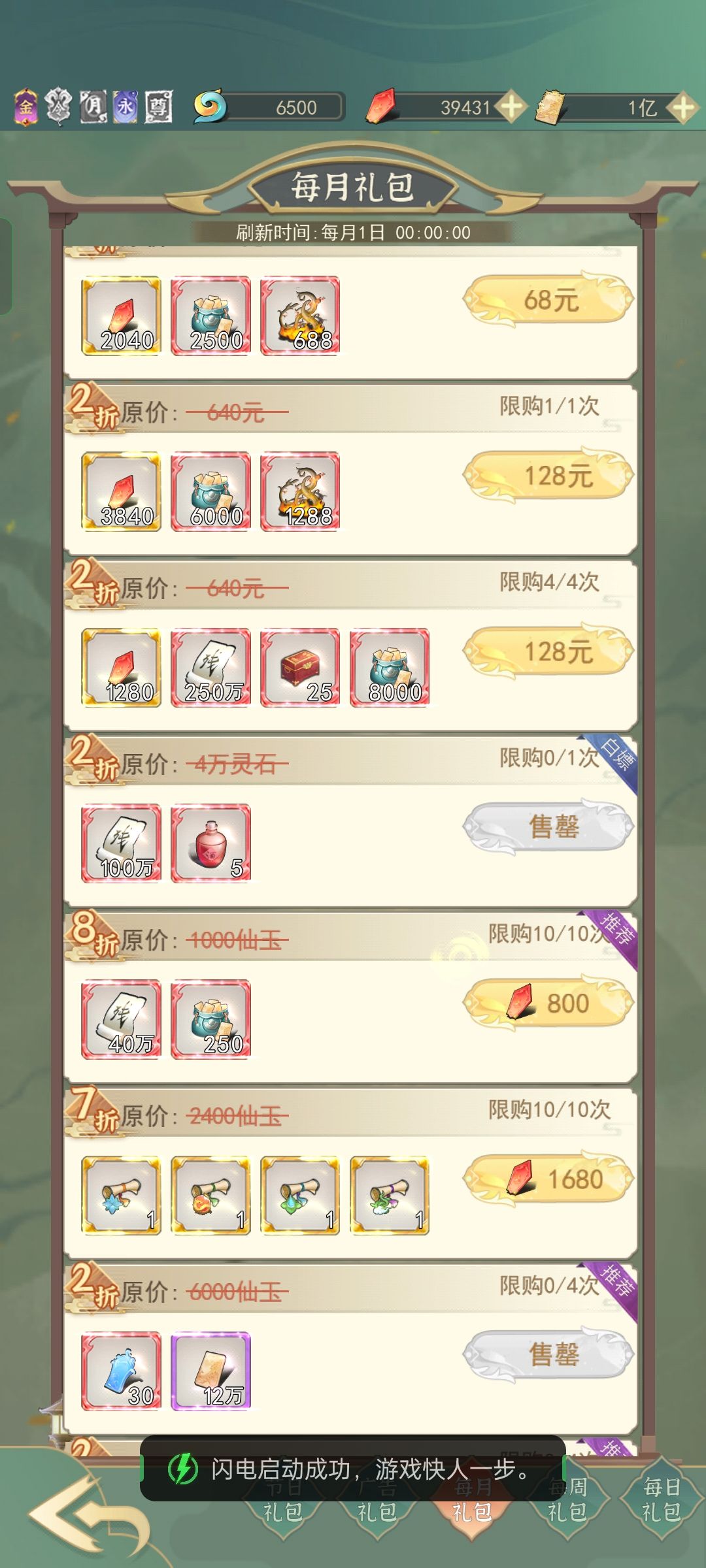 我这里是过了三十天的样子,新区前三十天下面有个新服礼包,灵石的卷轴和600仙玉的卷轴要买,等冲破虚的时候用,其他的不建议买。每日礼包灵石礼包和免费礼包每天买。每周礼包买灵石的和免费的。每月礼包灵石和免费得要买,法相石头和宠物抽奖石头要买,是最优惠的。