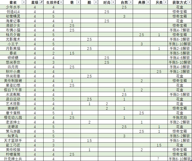 其中推荐练的套装是小王子和知更鸟,容易获取分数倍数高生效部位多还是四星套装不愁缺球。其他的风格找系数2.5~3左右的就行。