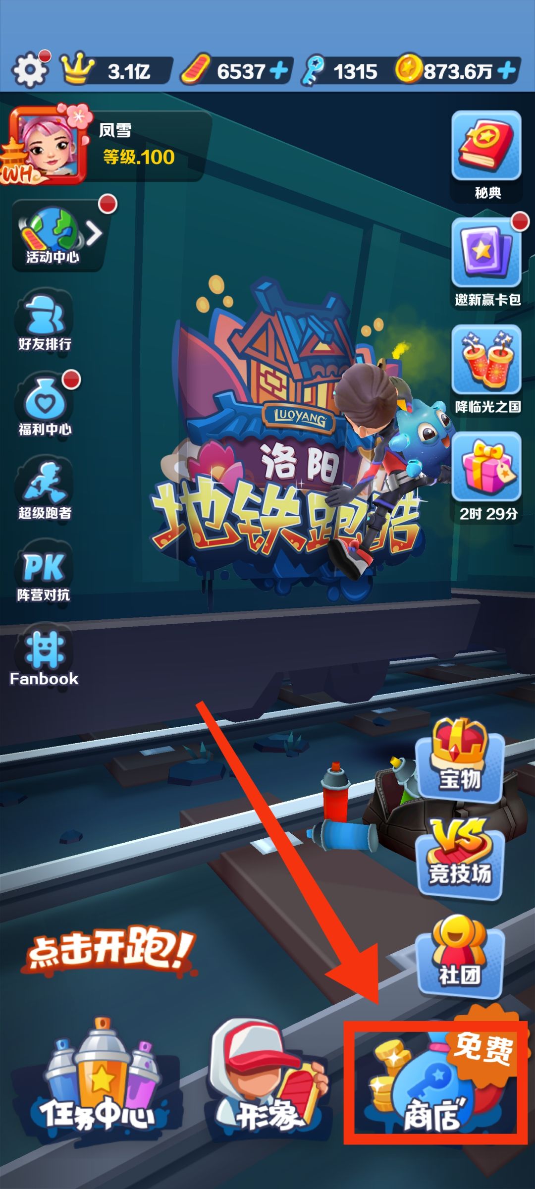接下来的话就是资源的获取啦,目前地铁跑酷的资源分为6种先说重要的排前面的就是蓝钥匙、宝物钥匙、金币啦,后面的是滑板、喷射起跑和得分被增。后3重道具都可以通过金币购买,我先来说前面的。