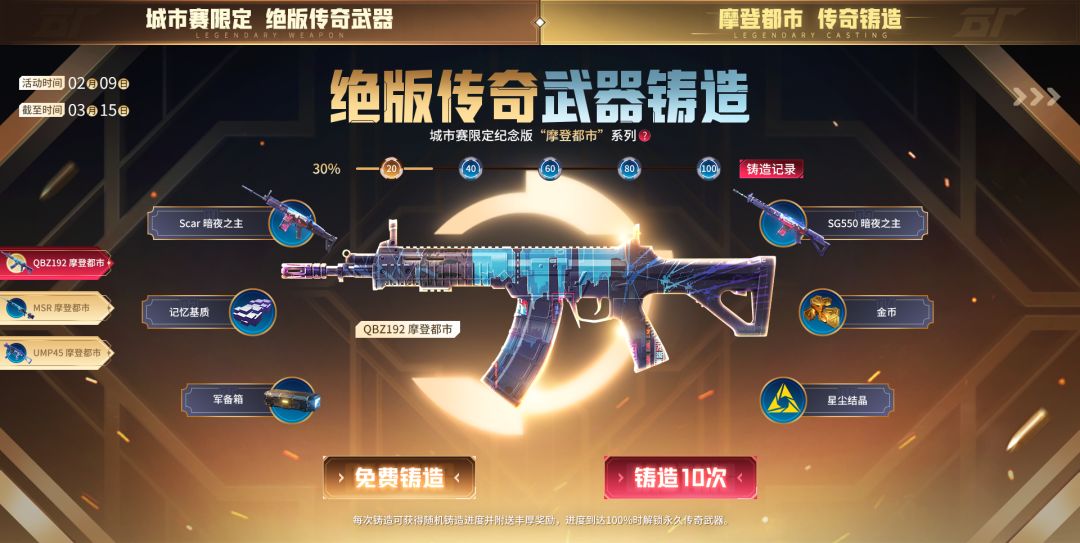 ◊2月9日-3月15日,开放城市赛限定纪念版“摩登都市”系列武器铸造,铸造过程有机会直接获得“摩登都市”系列传奇武器及“暗夜之主”系列史诗武器。